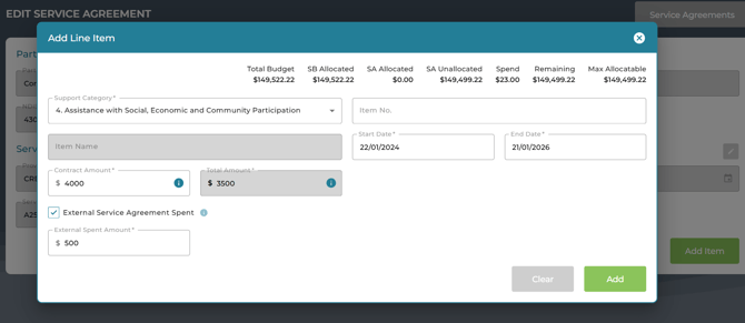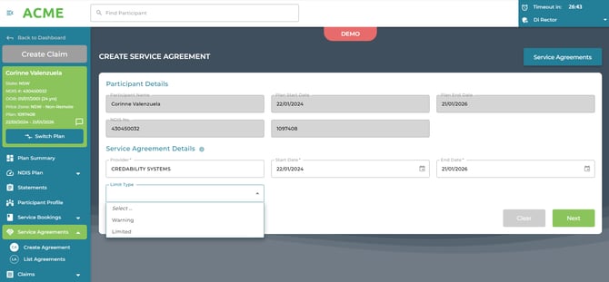 NOTE: From 17th October 2025, you can select a Limit Type on each Service Agreement. Choosing 'Warning' will trigger a claim line alert if the Service Agreement's allocated funds are exhausted, or if the current claim line would cause the allocation to be exceeded. Selecting 'Limited' will prevent the claim line from being processed in these scenarios.