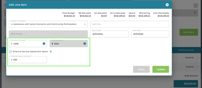 If the Service Agreement has been active and services have already been claimed outside of Planability, you can input the total Contract Amount. Next, enter the amount that has already been claimed outside of Planability - the External Spent Amount. The Total Amount will calculate to show the balance that needs to be set aside.