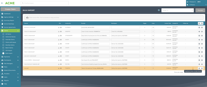 The Provider is identified from the ABN on the invoice as is the NDIS Participant - from the NDIS number. This removes the risk of data entry error - creating claims for the wrong provider or participant. Duplicate invoices are identified if there is already a created Claim for the provider with the same invoice number in the system.