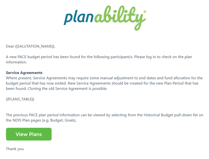 Trigger: Triggered when a PACE plan has been reassessed and new start and end dates have been received from PRODA. Emails are generated at 6am