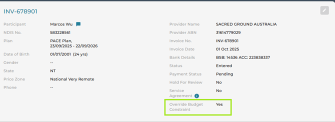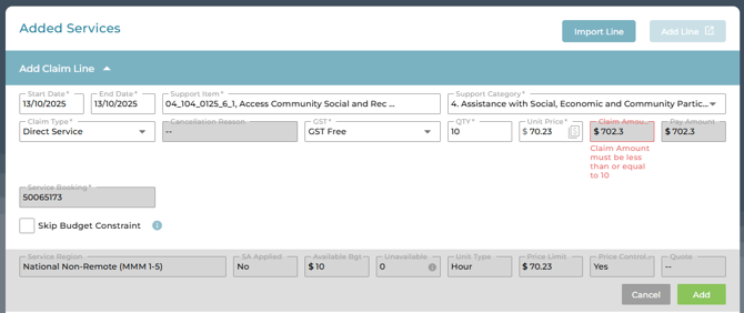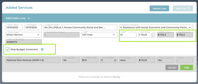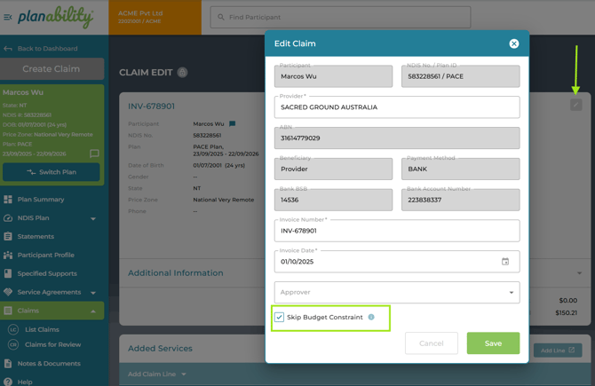 Next, edit the Claim Line to select to Skip Budget Constraint. This will skip the budget guardrails that would usually be applied to the claim line, allowing you to save the claim line, and submit to the NDIS.Select 'Skip Budget Constraint'