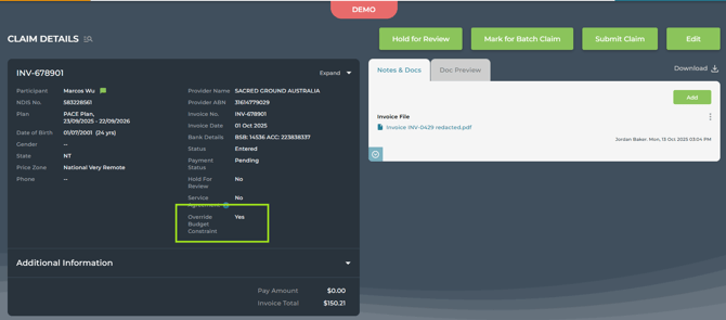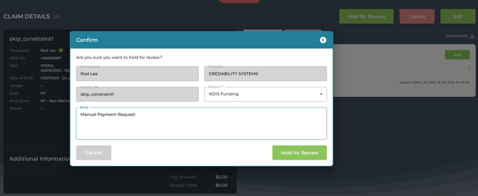 Override Planability budget guardrails to submit a claim for intentional rejection. Submit a Manual Payment Request in the NDIS Portal, and then import the approved PRNs back into Planability.