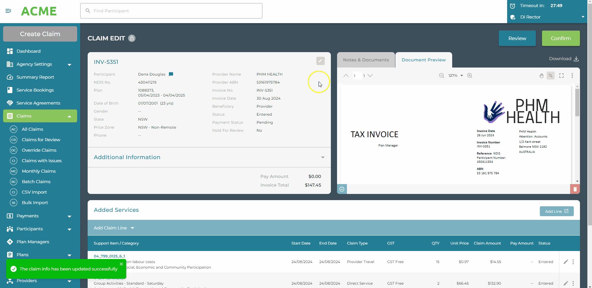 Submit Claim - Submit the claim to the NDIS for real-time claim submission. View the NDIS response to the claim, including the Payment Reference Number (PRN).
