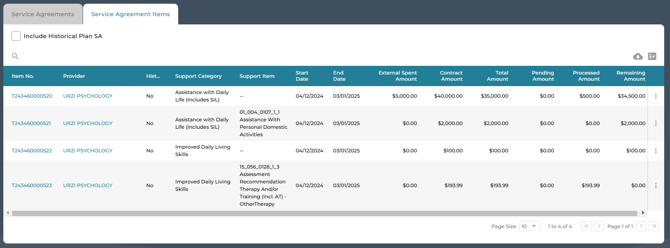 Service Agreement Items lists all items entered under the Parent agreement. They may be entered for a support category or item and their start and end dates must fall within the Parent agreement start and end dates.