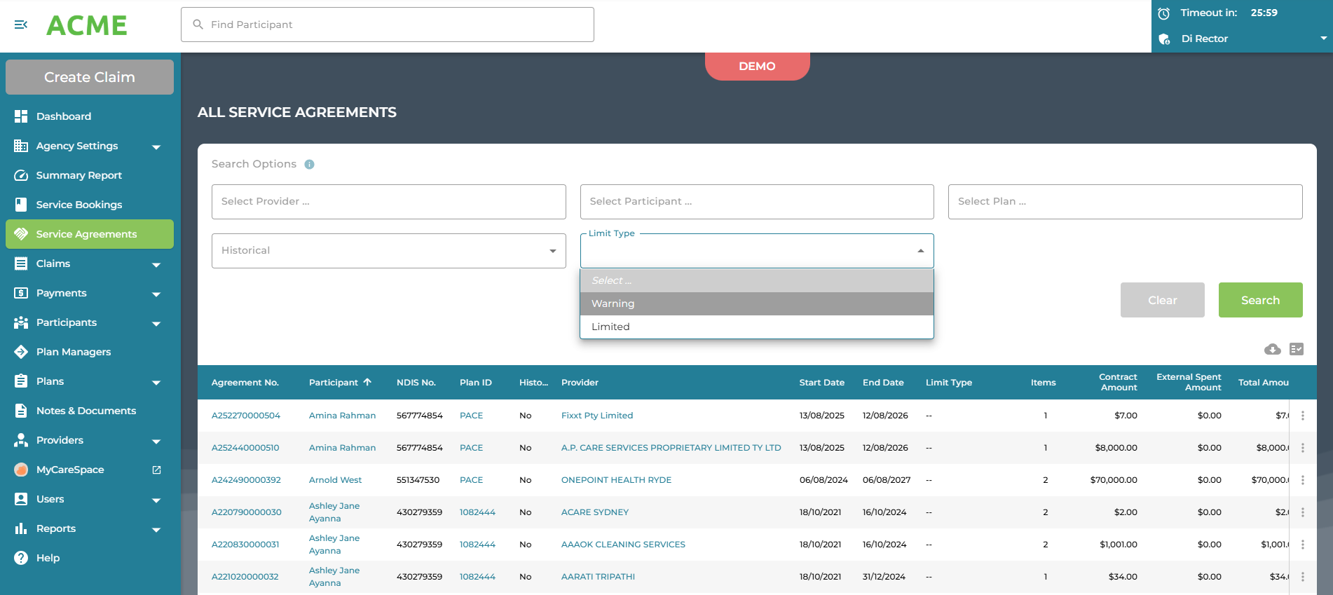 To view Service Agreements for a Participant and their current Plan, select the Participant and then select List Agreements from the menu.
